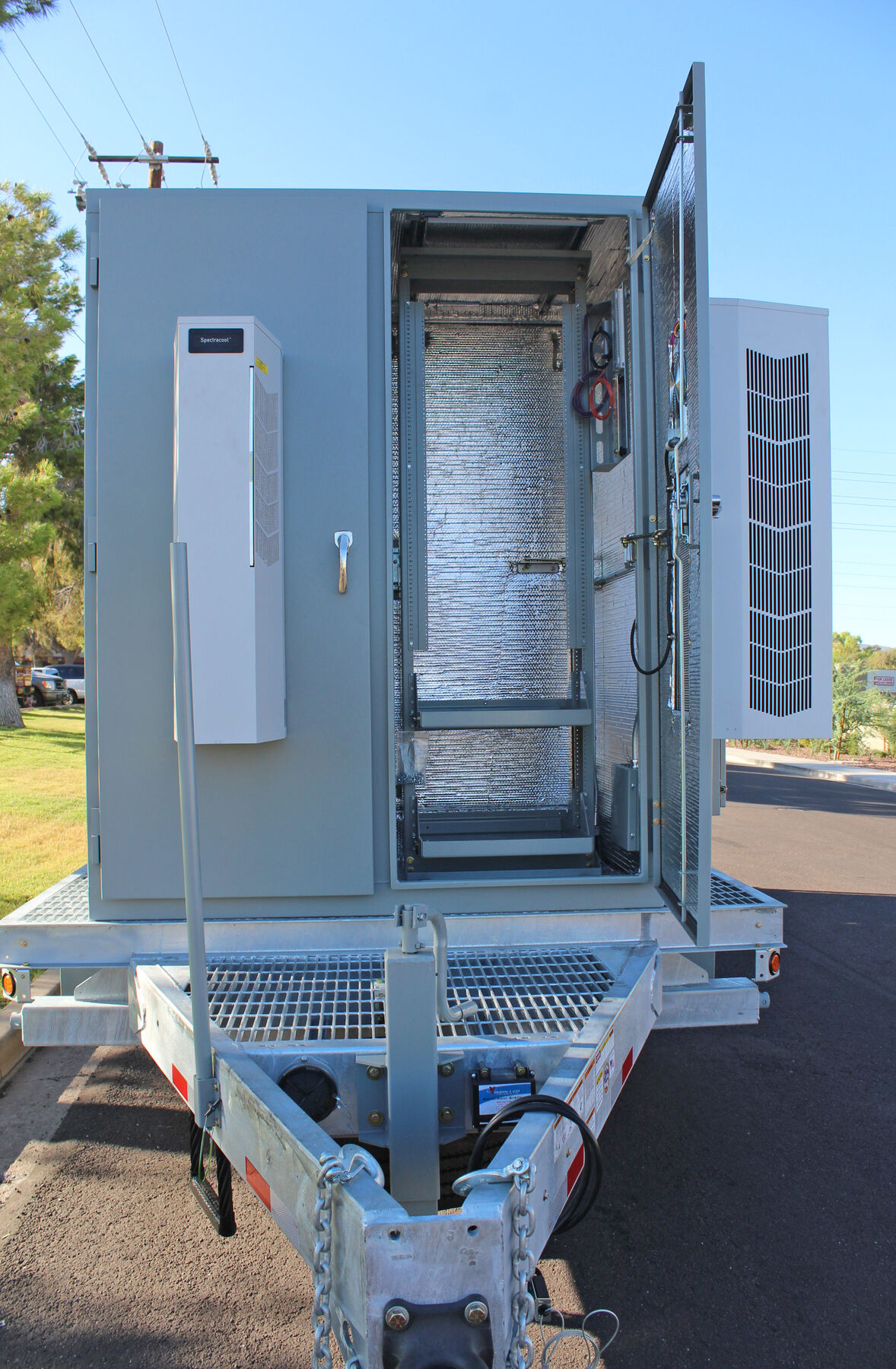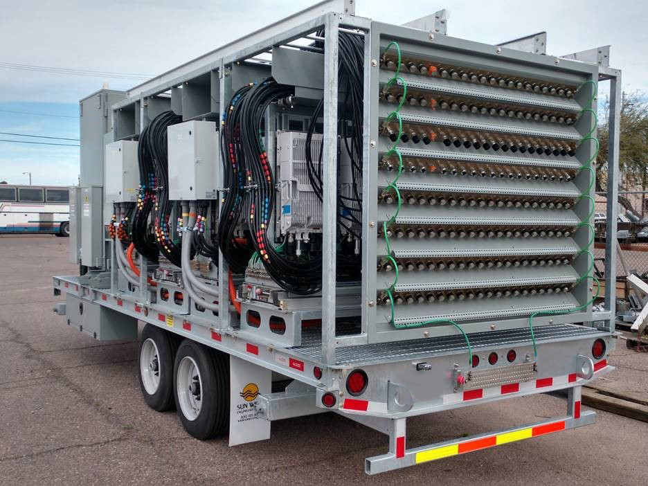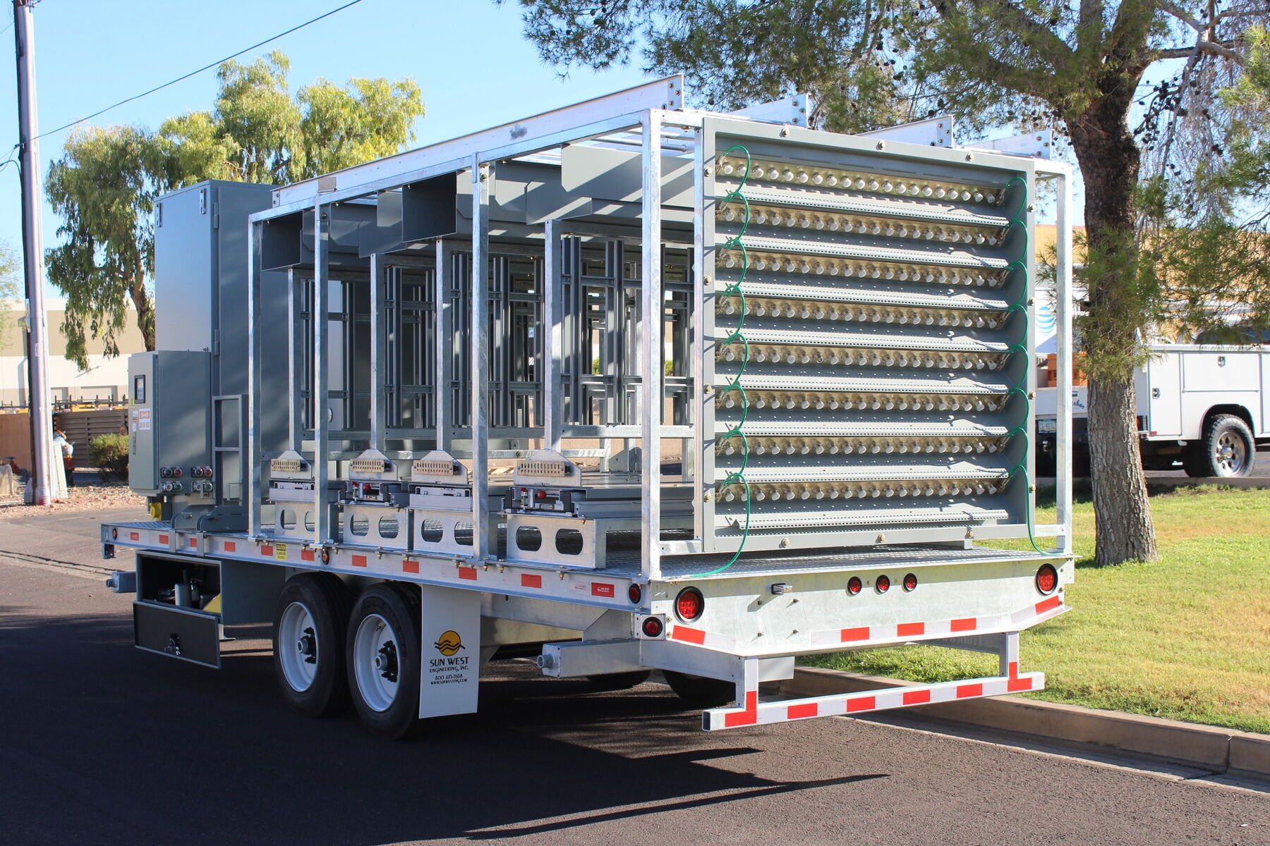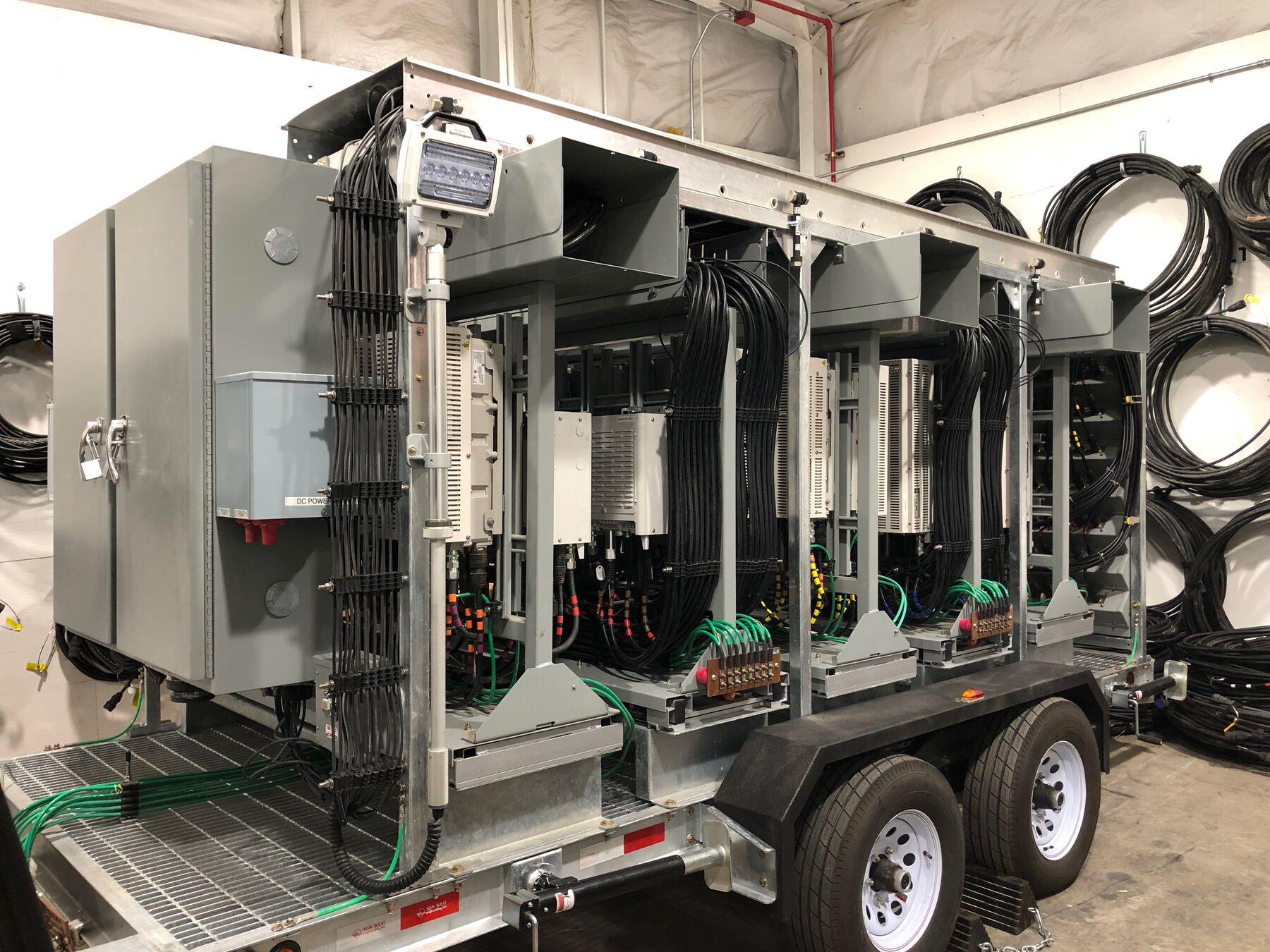 With today's ever growing special event deployments requiring larger quantities of equipment, Sun West Engineering has come to the rescue with the Remote Radio Head Trailer. This trailer has the ability to pack 40 installed and plumbed remote radio heads in a relatively small space. All RRUs are installed on full-extension ball-bearing steel slide-outs, allowing for ease of installation/maintenance and additional cooling when necessary. The RRUs are permanently plumbed to a rear mounted bulkhead port panel so the equipment trailer can be pulled up alongside another COW (like the scissor lift COW), and connect directly to the antennas or another bulkhead port panel, thus speeding up the deployment.