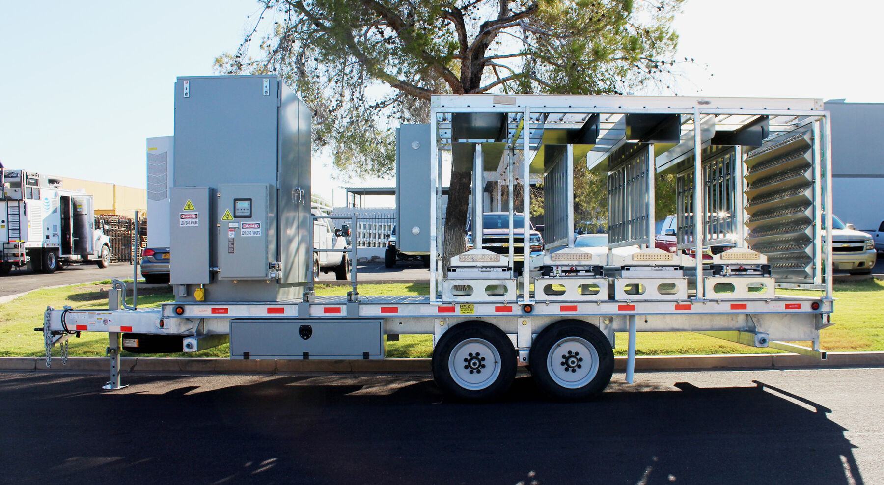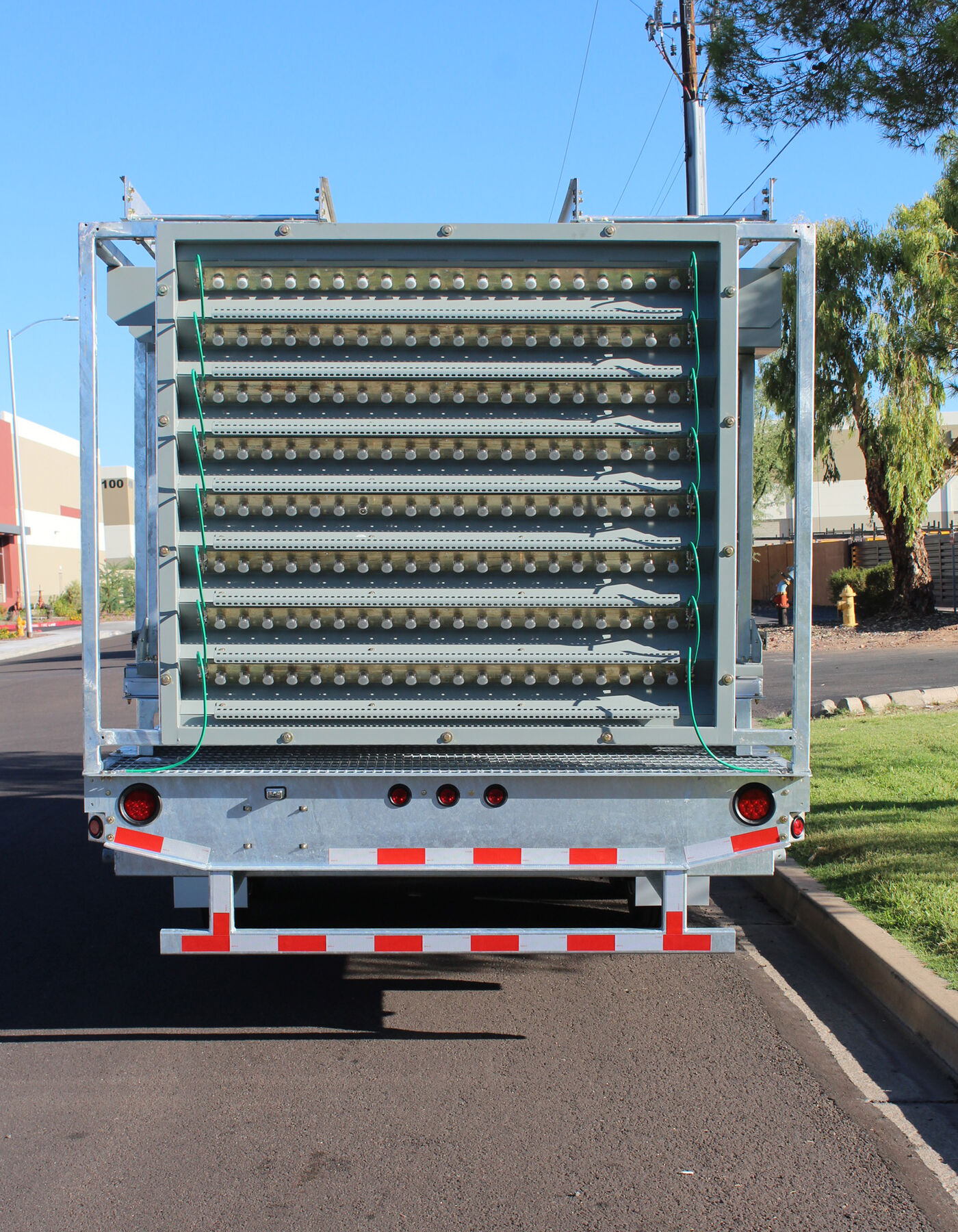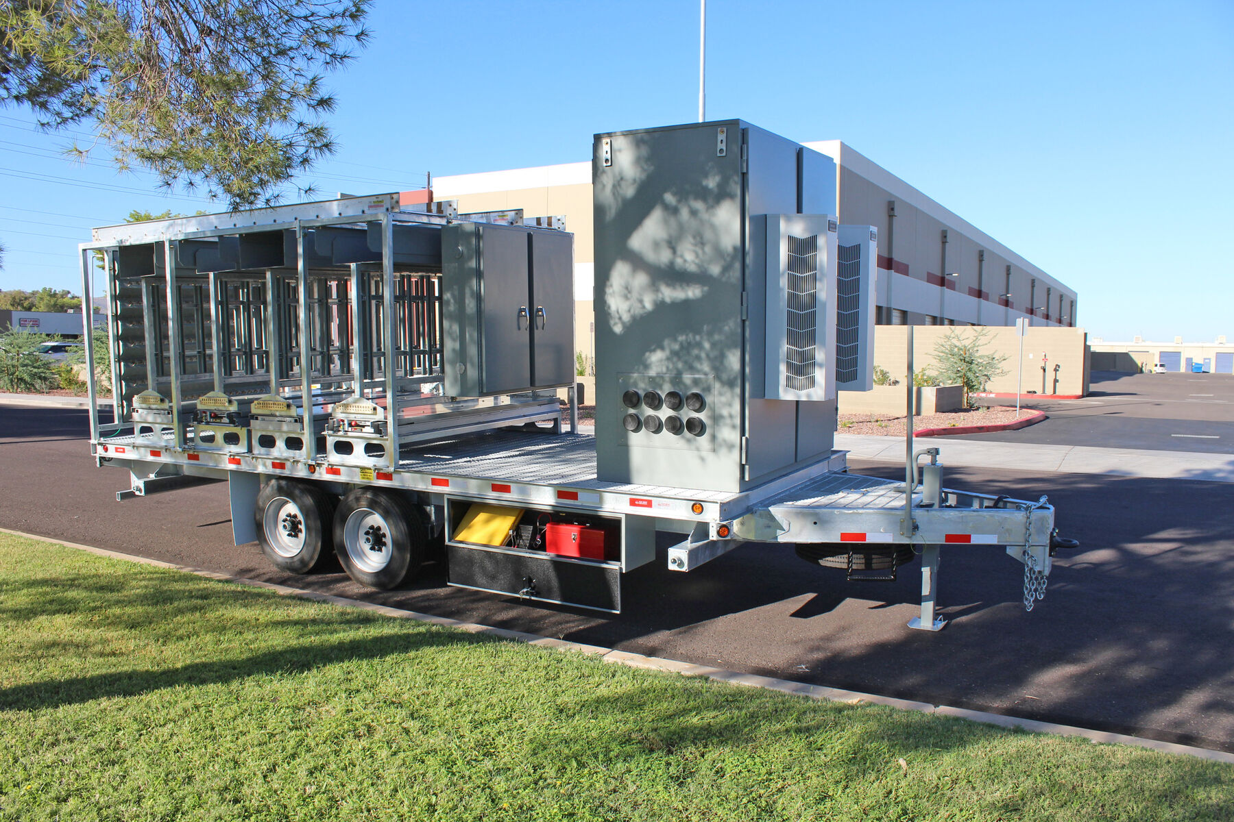 With today's ever growing special event deployments requiring larger quantities of equipment, Sun West Engineering has come to the rescue with the Remote Radio Head Trailer. This trailer has the ability to pack 40 installed and plumbed remote radio heads in a relatively small space. All RRUs are installed on full-extension ball-bearing steel slide-outs, allowing for ease of installation/maintenance and additional cooling when necessary. The RRUs are permanently plumbed to a rear mounted bulkhead port panel so the equipment trailer can be pulled up alongside another COW (like the scissor lift COW), and connect directly to the antennas or another bulkhead port panel, thus speeding up the deployment.