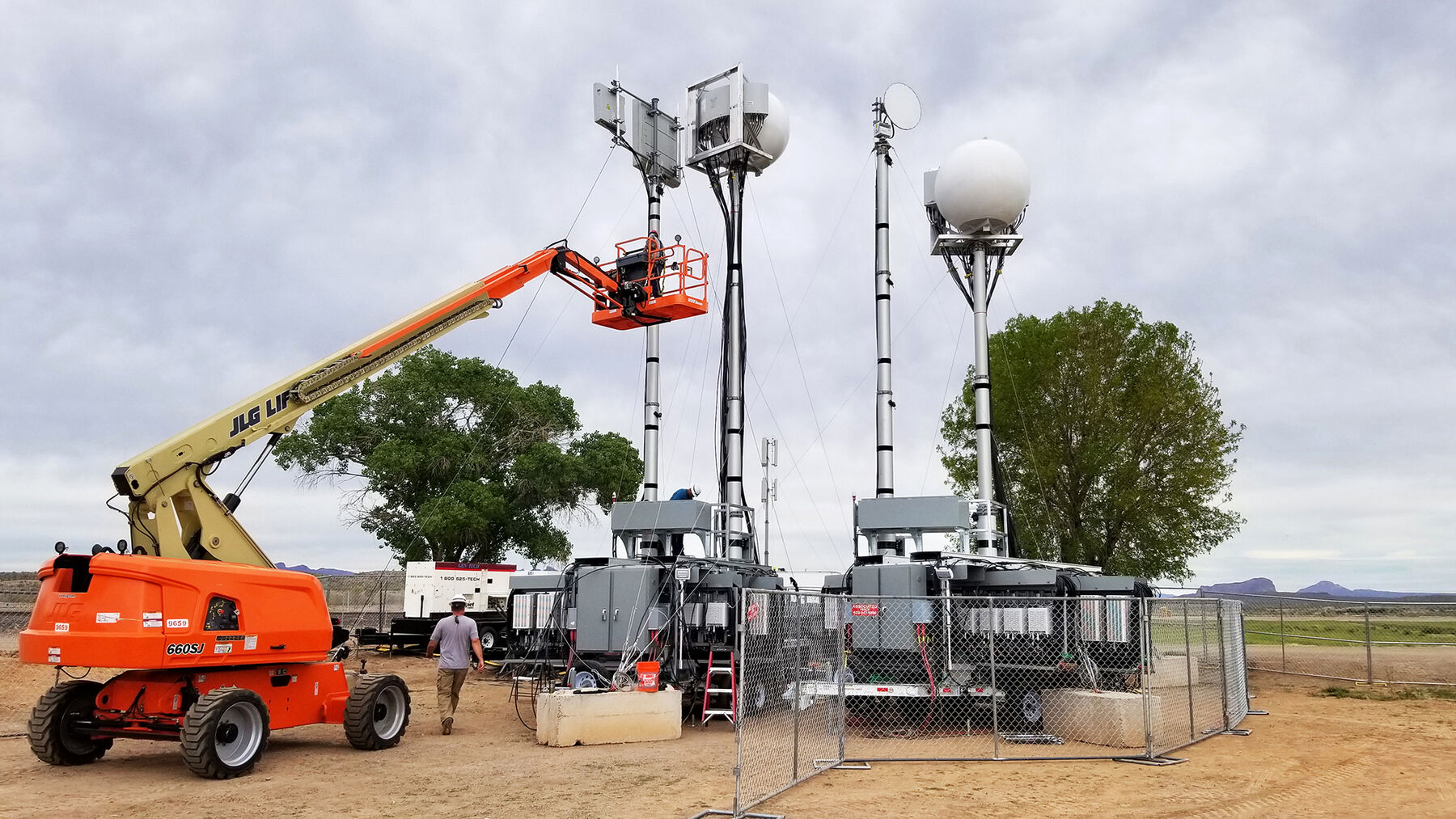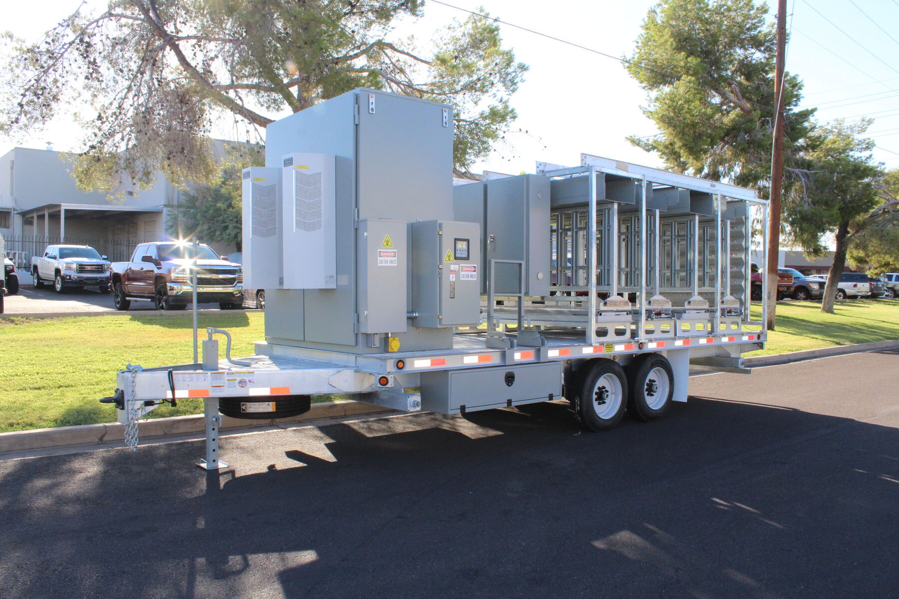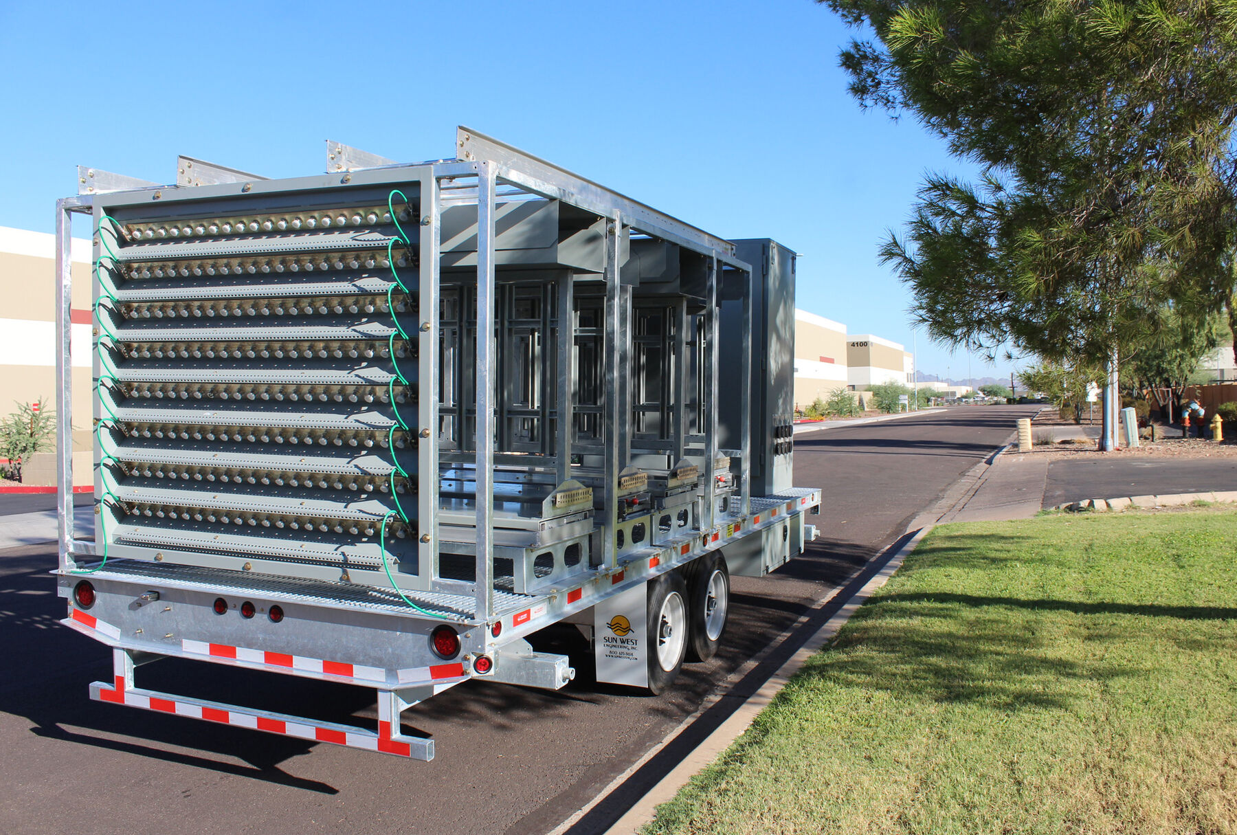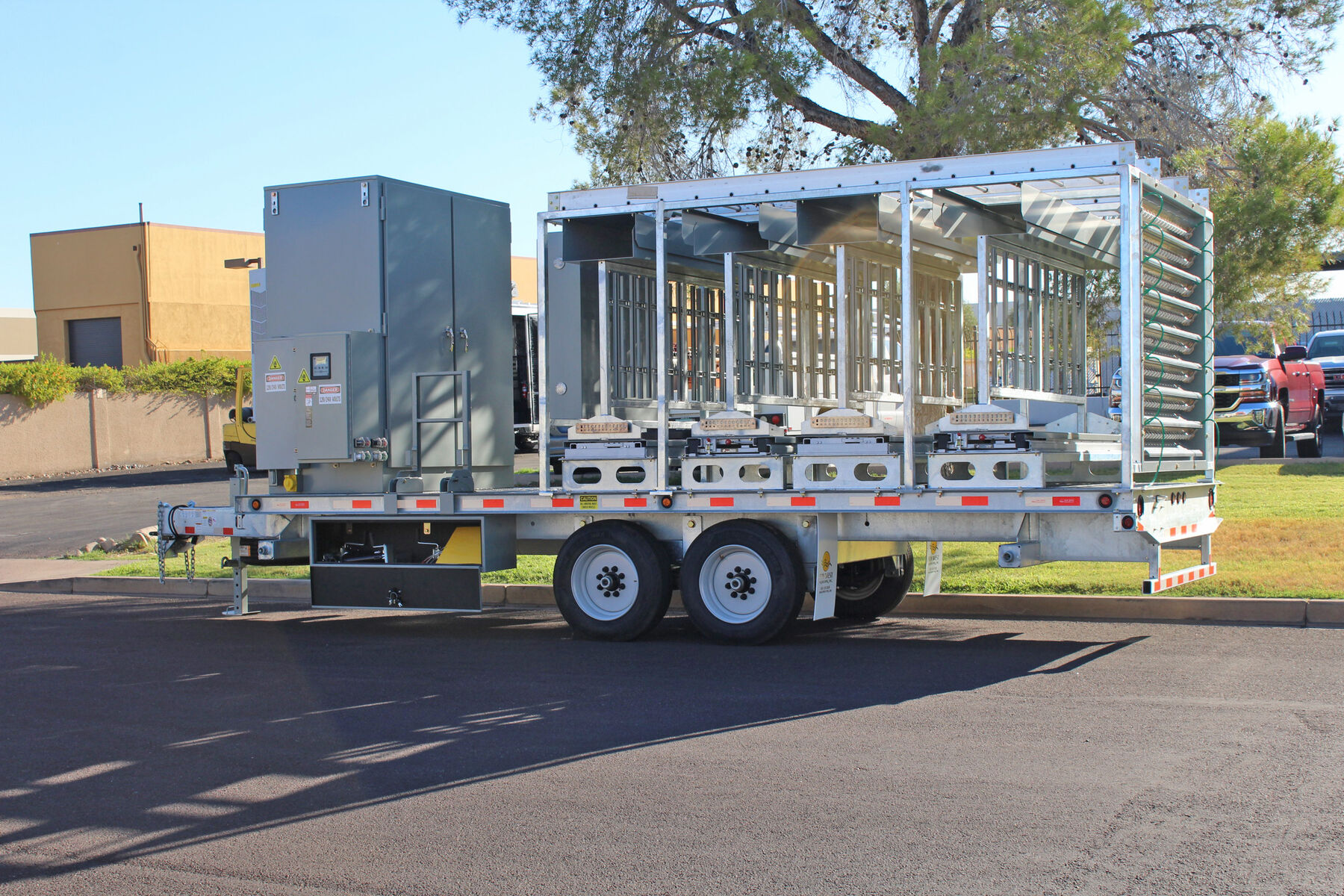With today's ever growing special event deployments requiring larger quantities of equipment, Sun West Engineering has come to the rescue with the Remote Radio Head Trailer. This trailer has the ability to pack 40 installed and plumbed remote radio heads in a relatively small space. All RRUs are installed on full-extension ball-bearing steel slide-outs, allowing for ease of installation/maintenance and additional cooling when necessary. The RRUs are permanently plumbed to a rear mounted bulkhead port panel so the equipment trailer can be pulled up alongside another COW (like the scissor lift COW), and connect directly to the antennas or another bulkhead port panel, thus speeding up the deployment.