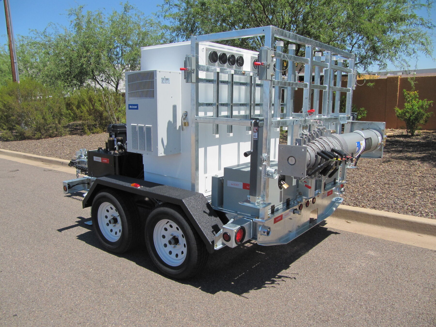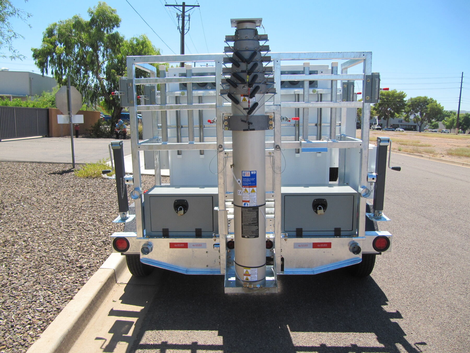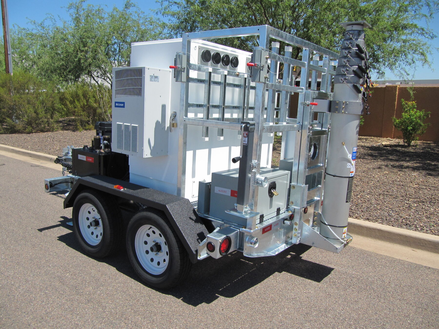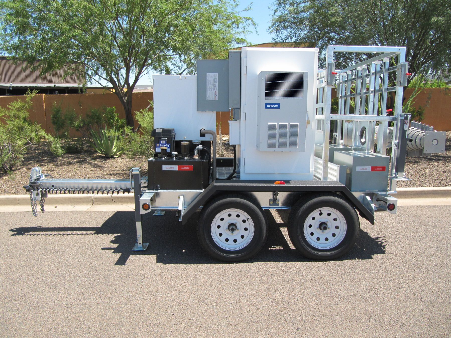 This COW is specially designed to have a maximum travel height of just 7 feet! With this low travel height it can be pulled through nearly any parking garage and set up on the roof in just minutes. The rotating 25’ mast is easily spun into the vertical position and locked down for deployment. The retractable trailer tongue is slid into its stowed position, and the unit only takes up one parking space. Fire up the on-board 10kW generator with 45 gallon fuel tank and this COW can graze for nearly 2 full days!